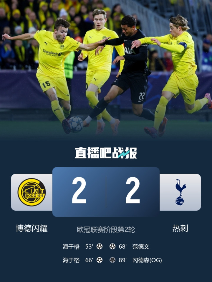 欧冠-热刺2-2绝平博德闪耀海于格个人秀双响范德文破门
