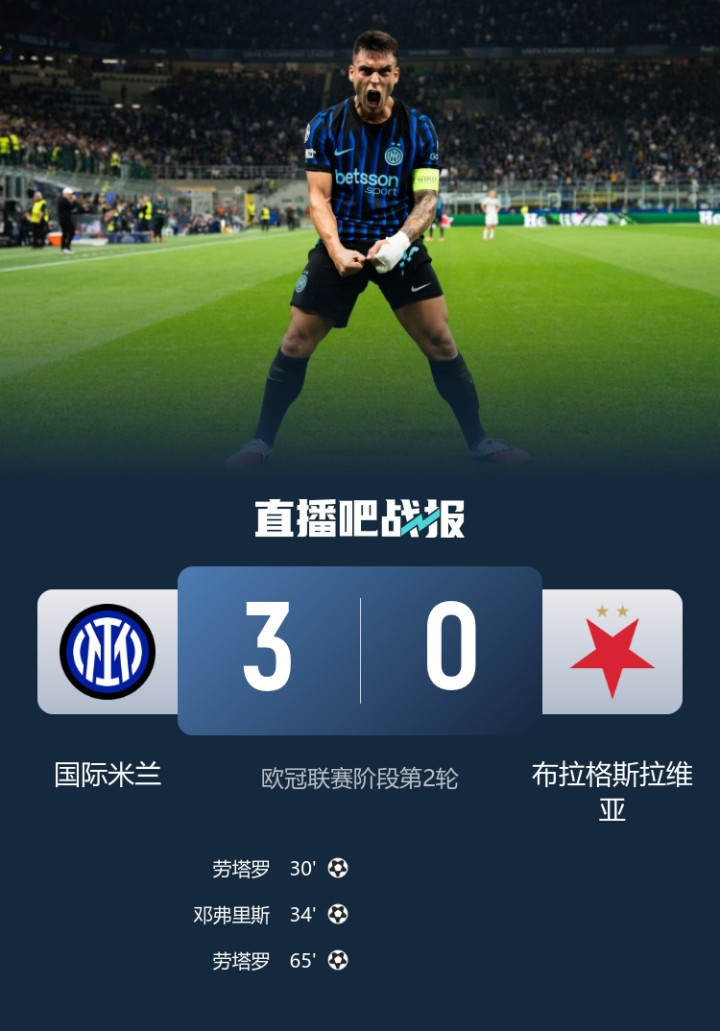 国米3-0布拉格斯拉维亚欧冠两连胜劳塔罗双响邓弗里斯建功
