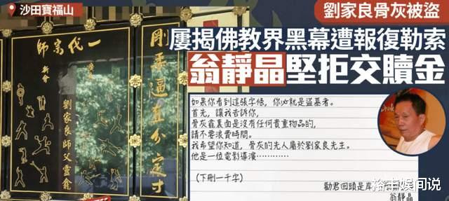 翁静晶表示,字条的内容则是为了警告“盗墓者”,并表示骨灰龛里并没有任何的陪葬品,并介绍了刘家良的生平,即便是这样,仍然遭到了盗窃。