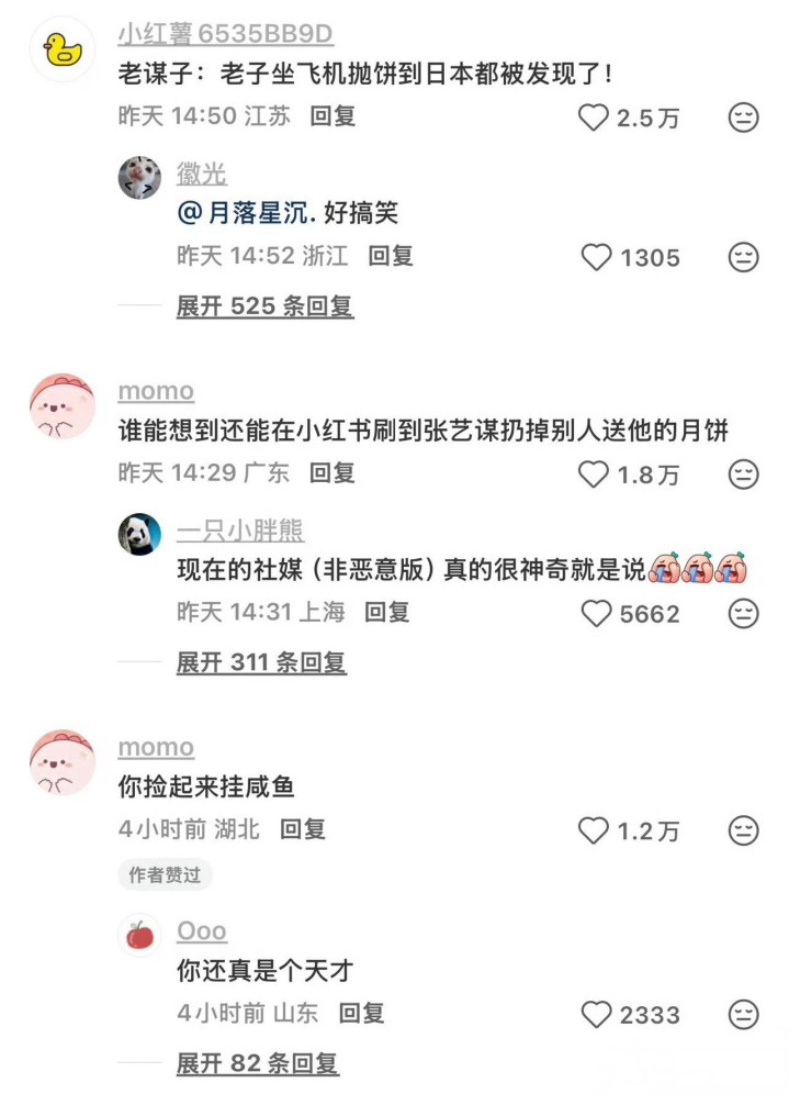 也有人感慨:“张导拍了几十年戏,没想到最出圈的是个被扔的月饼盒。”