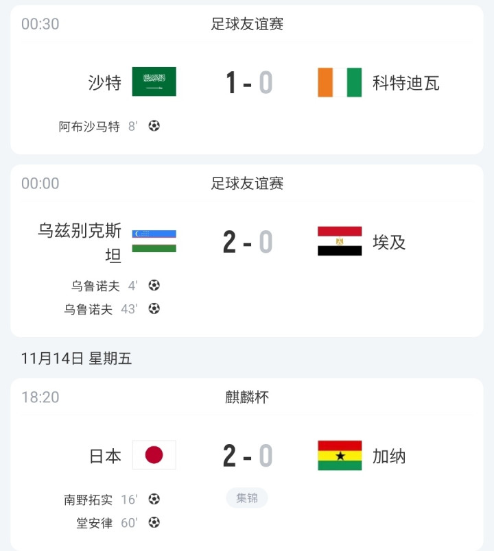 直播吧11月17日讯在本次国际比赛日的首场比赛中,三支已经提前晋级世界杯的亚洲球队日本、乌兹别克斯坦和沙特,均选择了非洲球队作为对手,并取得胜利。