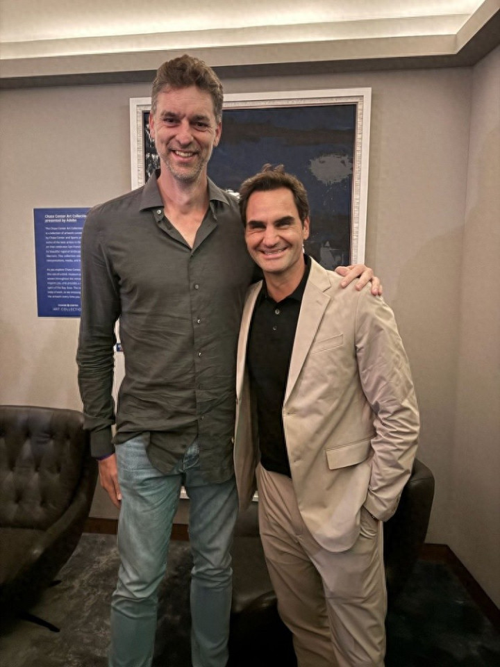 直播吧9月22日讯 今天,前NBA球员保罗-加索尔在社媒上晒出了和网球名将费德勒的合影。