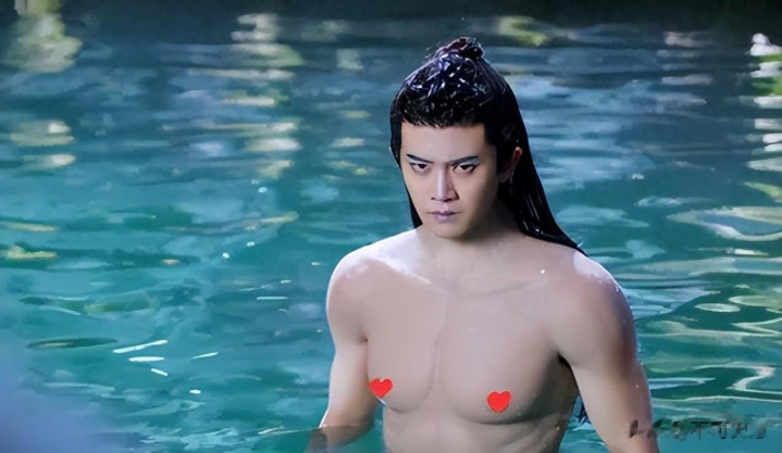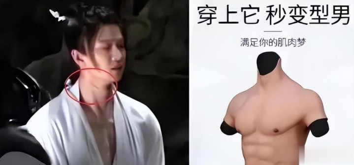 还有凭《青青子衿》小范围走红的范世錡,剧中露胸肌时同样被发现不对劲,腹肌和脖子肤色差太大,侧面看像贴了块厚硅胶。