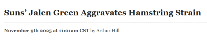 北京时间11月10日,据太阳队记兰金报道,太阳队担心杰伦-格林可能会缺席多场比赛,他在周日战胜快船队的比赛中加重了右腿筋拉伤。